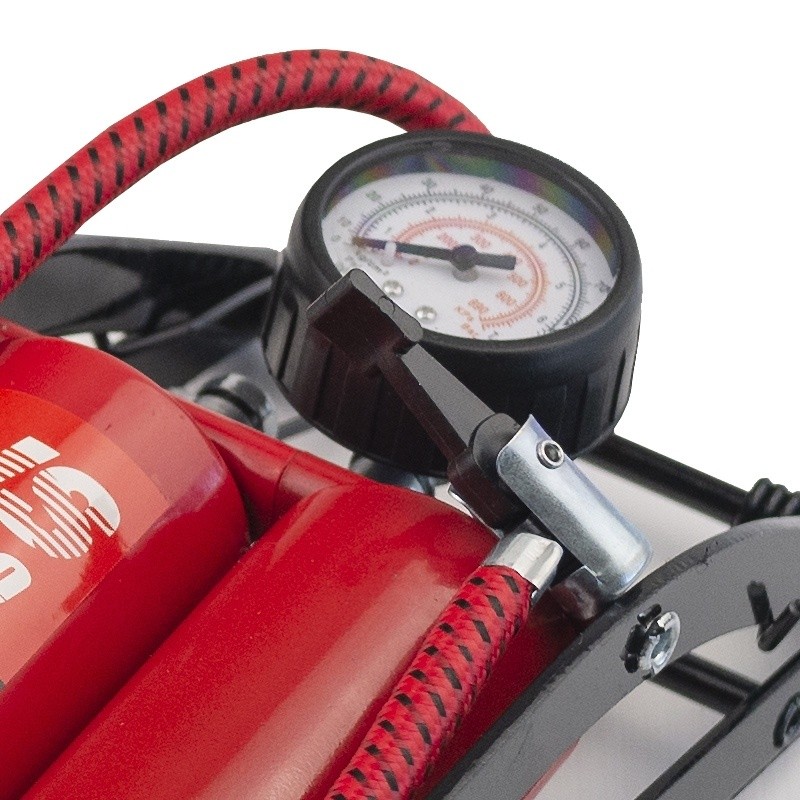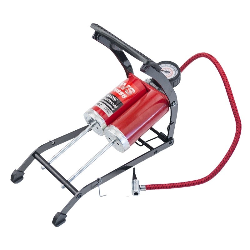 Насос состоит из опорной рамы, педали, поршня со штоком, 2х цилиндров, возвратной пружины, манометра со шлангом и невозвратным клапаном.