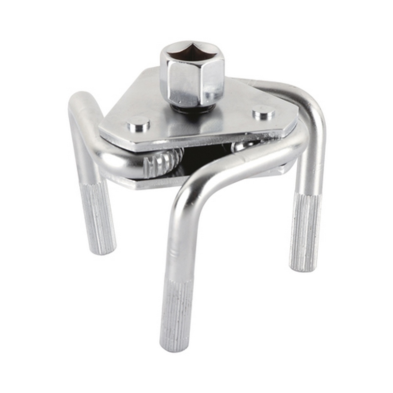 Съемник масляного фильтра состоит из круглой металлической головки с зубчатыми краями для регулировки и захвата, трех лапок, выходящих из головки и обхватывающих фильтр, и квадратного хвостовика в центре головки для крепления к трещотке или гаечному ключу.