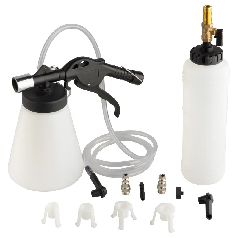 Состоит из заправочной ёмкости объёмом 1,0 литр, ёмкости для сбора отработанной жидкости в сборе с вакуумным пистолетом, прозрачного шланга и пластиковых переходников.