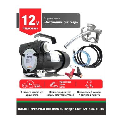 Топливоперекачивающий насос «Стандарт-м» требует напряжения в 12 вольт, и может заряжаться от стандартного автомобильного аккумулятора.