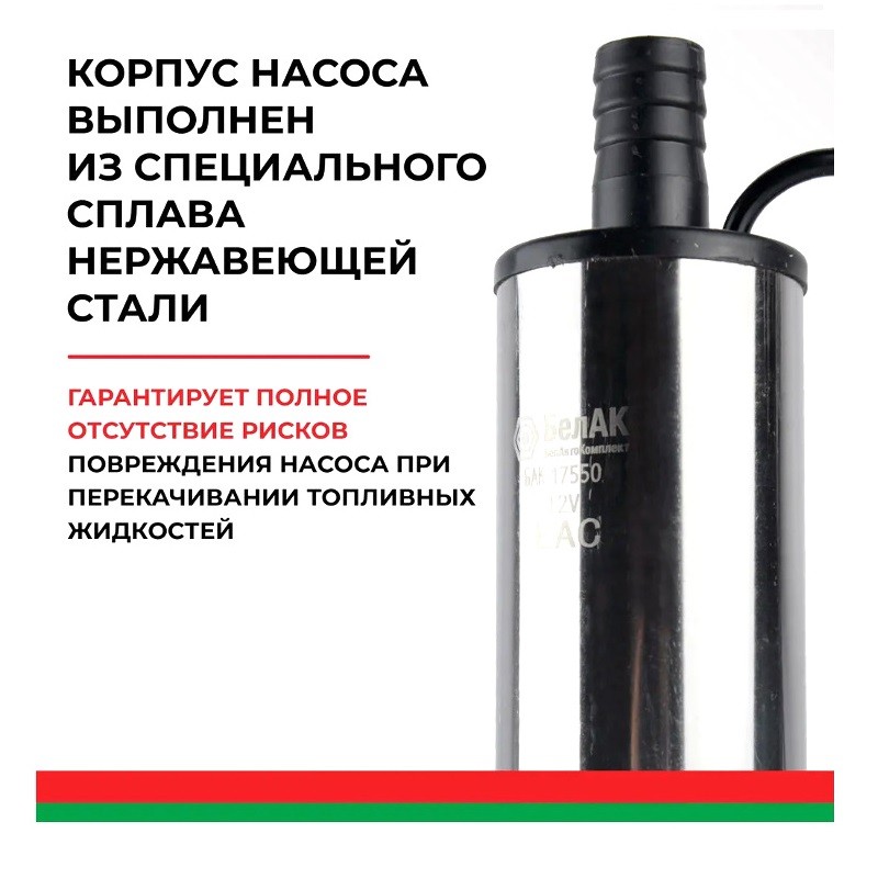 Насос перекачки топлива погружной центробежный 12V БAK.17550 производства компании "БелАвтоКомплект" предназначен для перекачки дизельного топлива, керосина, антифриза, а также заправки транспортных средств в полевых условиях.