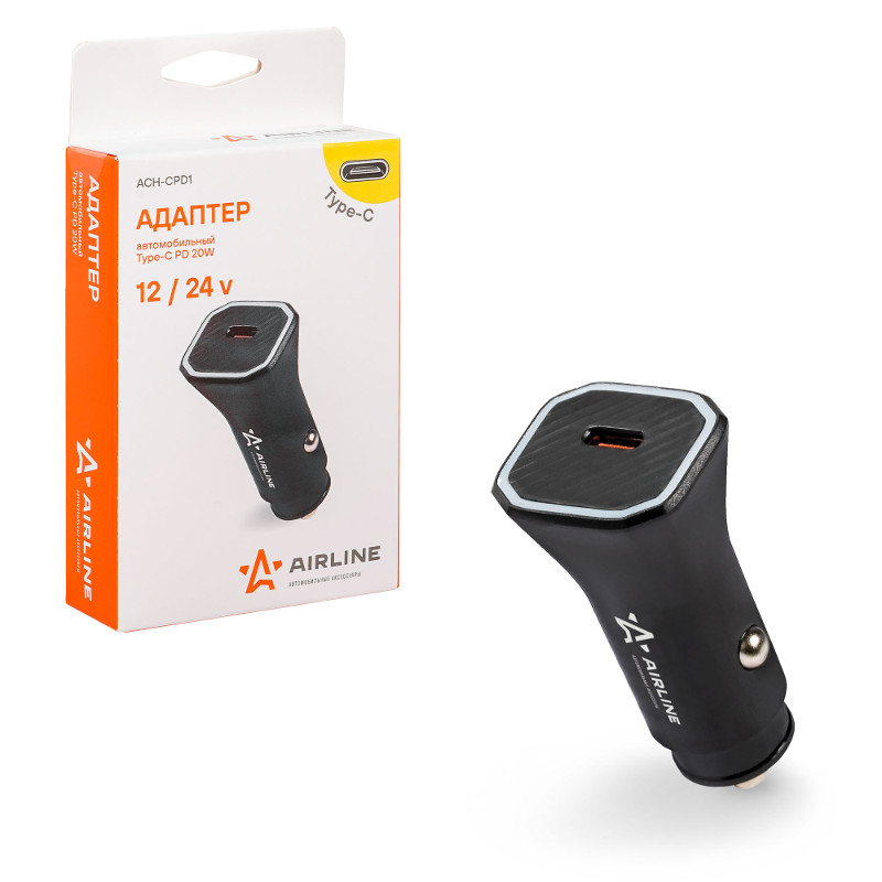 Адаптер подключается в розетку прикуривателя автомобиля 12/24В и позволяет заряжать мобильные устройства от встроенного гнезда USB Type-C.