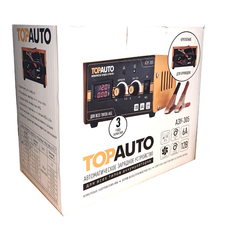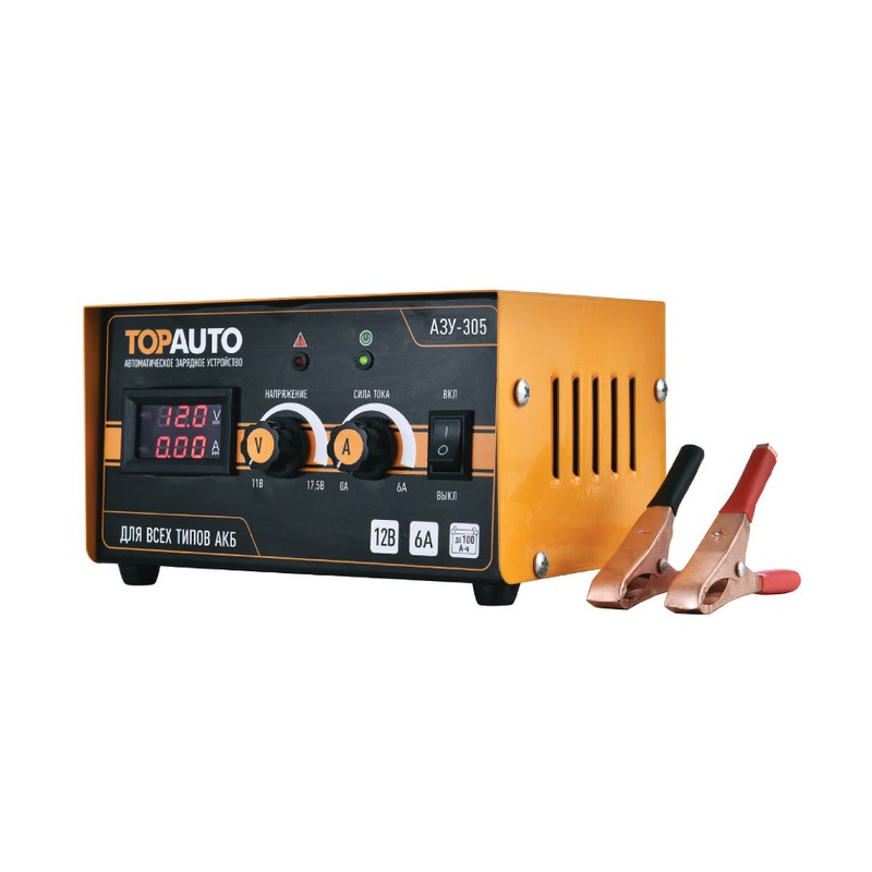Импульсное зарядное устройство для автомобильного аккумулятора АЗУ-305 автоматического типа предназначено для бережной и эффективной зарядки АКБ 12В (12V) – всех типов свинцово-кислотных аккумуляторных батарей, в т.ч. так называемых «мокрых», необслуживаемых, клапанных (для источников бесперебойного питания), гибридных, абсорбирующих стекловолоконных, с пластинами легированными кальцием и серебром и большинства гелевых АКБ.
