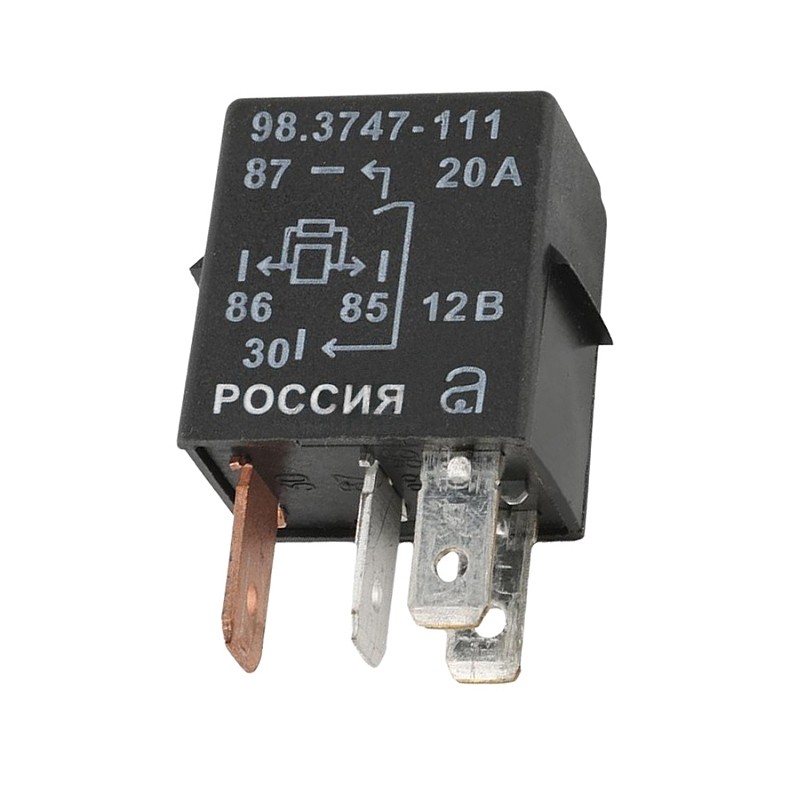 РЕЛЕ 98.3747-111 С ЗАМЫКАЮЩИМИ КОНТАКТАМИ и Т-образным выступом 4-х КОНТАКТНОЕ, с помехоподавляющим сопротивлением, предназначено для коммутации электрических цепей. Применяется на а/м ГАЗ, ВАЗ (реле электровентилятора КАЛИНА)