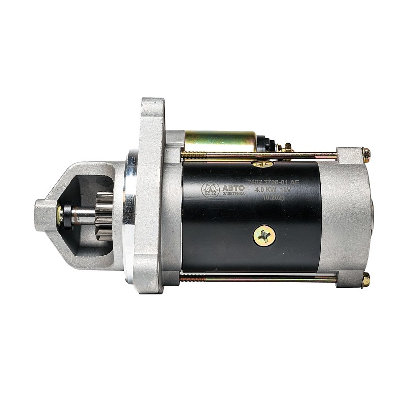 Стартер 2402.3708-01 АЕ, редукторный, предназначен для запуска двигателей Д-243, Д-245, Д181Т, ЛТЗ-145 и их модиф. тракторов "Беларусь" МТЗ-80 и их модиф., автомобилей и другой спецтехники. Стартер представляет собой электродвигатель постоянного тока последовательного возбуждения с электромагнитным реле, планетарным редуктором и муфтой свободного хода, кратковременного режима работы с длительностью не более 10 с.