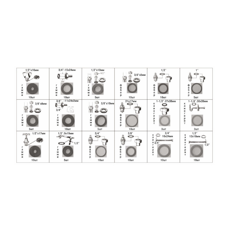 Гамми: 1/2" х 16 мм - 10шт; 3/4" х 15х24 мм - 10шт; 1/2" х 10 мм - 5шт; 3/8" х 8 мм - 5шт; 3/4" х 11х24х2 мм - 10шт; 3/8" х 10 мм - 5шт; 1/2" х 17 мм - 10шт; 1/2" х 9х19 мм - 5шт.