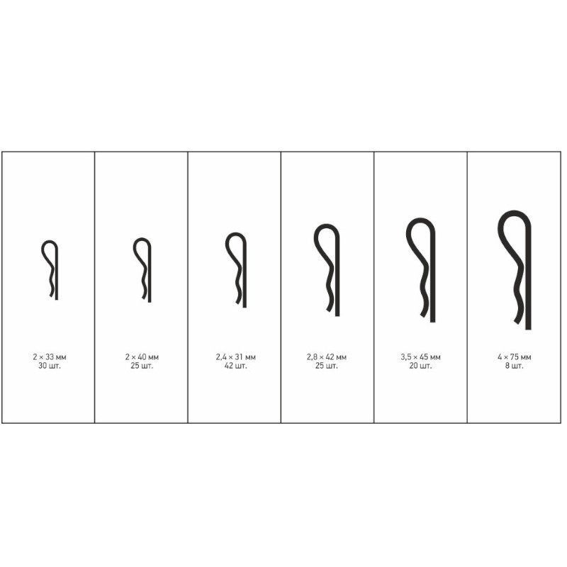 Комплектация: 2х33 мм - 30шт; 2х40 мм - 25шт; 2.4х31 мм - 42шт; 2.8х42 мм - 25шт; 3.5х45 мм - 20шт; 4х75 мм - 8шт.
