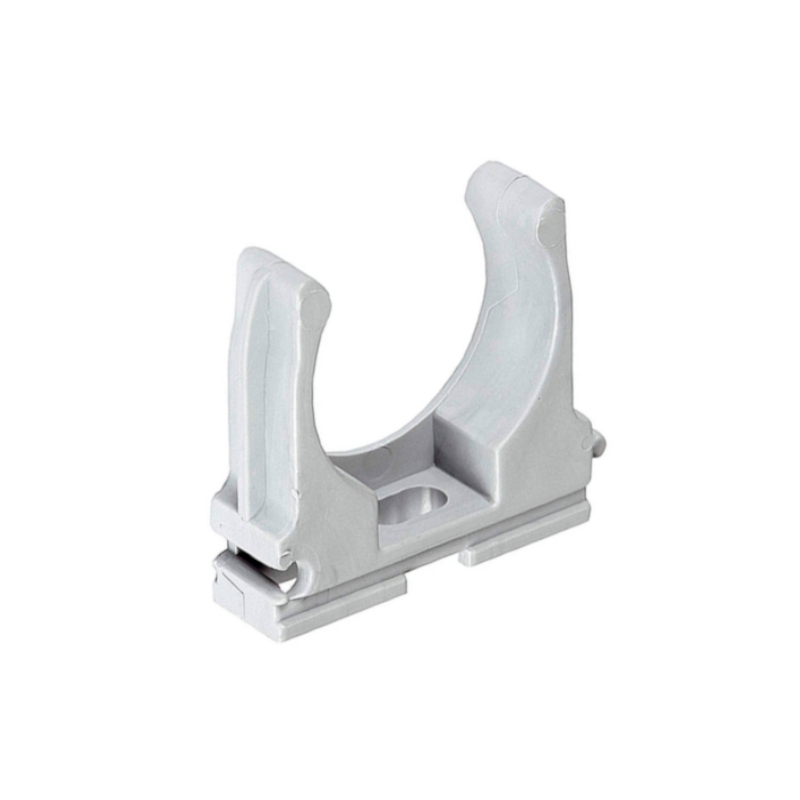 Скоба с защелкой предназначена для крепления гофрированных и гладких труб. Конструкция позволяет соединять между собой несколько держателей. Крепление держателя к поверхности осуществляется при помощи дюбель-гвоздей или саморезов. Надежное крепление трубы внутри скобы обеспечивается защелкой.