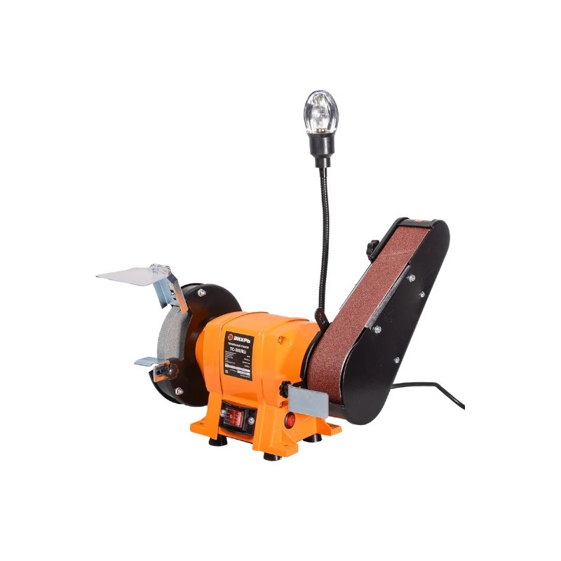 Электродвигатель мощностью 300 Вт через ротор приводит в движение валы с абразивным кругом и шлифовальной лентой. Они вращаются со скоростью 2950 об/мин. Круг имеет габариты 150 х 16 мм с посадочным диаметром 12,7 мм, лента – 50 х 686 мм. Точильный станок оборудован искрогасителем и защитным экраном, чтобы отражать окалину и защищать оператора от попадания искр и абразива в лицо. Рабочие упоры позволяют опереть изделия и предотвратить его соскальзывание с абразивной поверхности.
