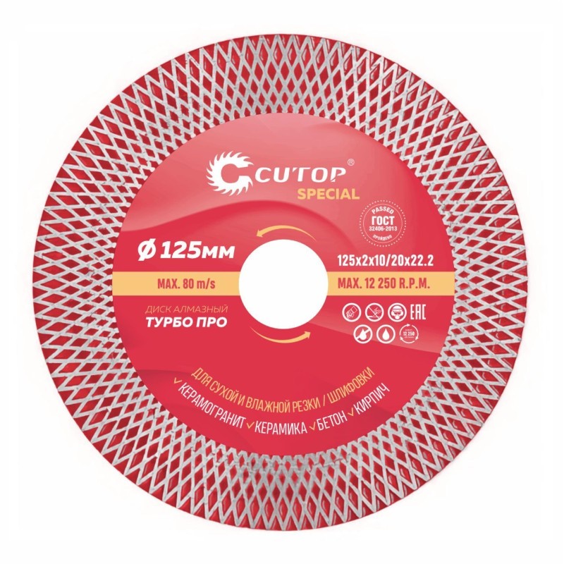 125 × 2 × 10/20 × 22,2 мм. Предназначен для резки/шлифовки керамогранита, твердой и мягкой керамической плитки, искусственного и натурального камня. Материал: инструментальная сталь, высокотехнологичные синтетические алмазы. Тип упаковки: блистер.