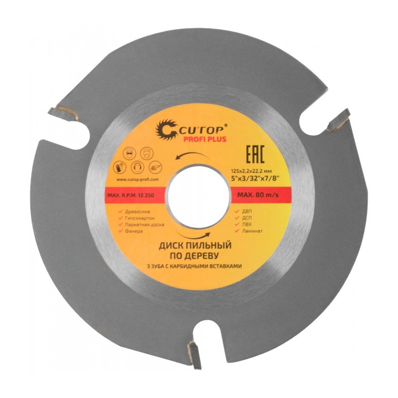 Диск пильный по дереву для УШМ Profi Plus (125x2.2x22.2 мм; 3 зуба с карбидными вставками) CUTOP 75-587 предназначен для использования совместно с УШМ и применяется для чистого и ровного реза древесины, гипсокартона, паркетных досок, фанеры, ДВП, ДСП, ПВХ, ламината.