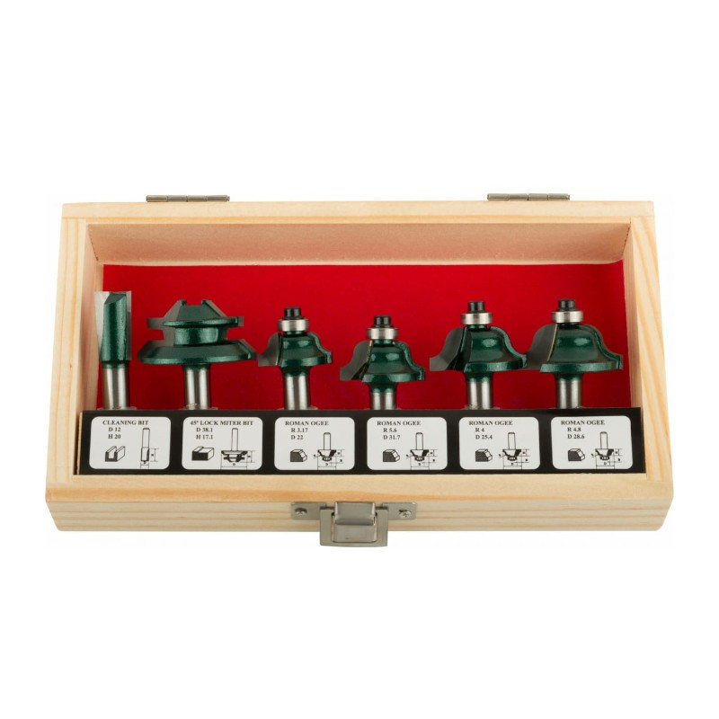 Фрезы по дереву кромочные (6 шт; хвостовик 8 мм) в деревянном боксе FIT 36572 используется для работ по дереву, для фрезерования кромок и пазов.