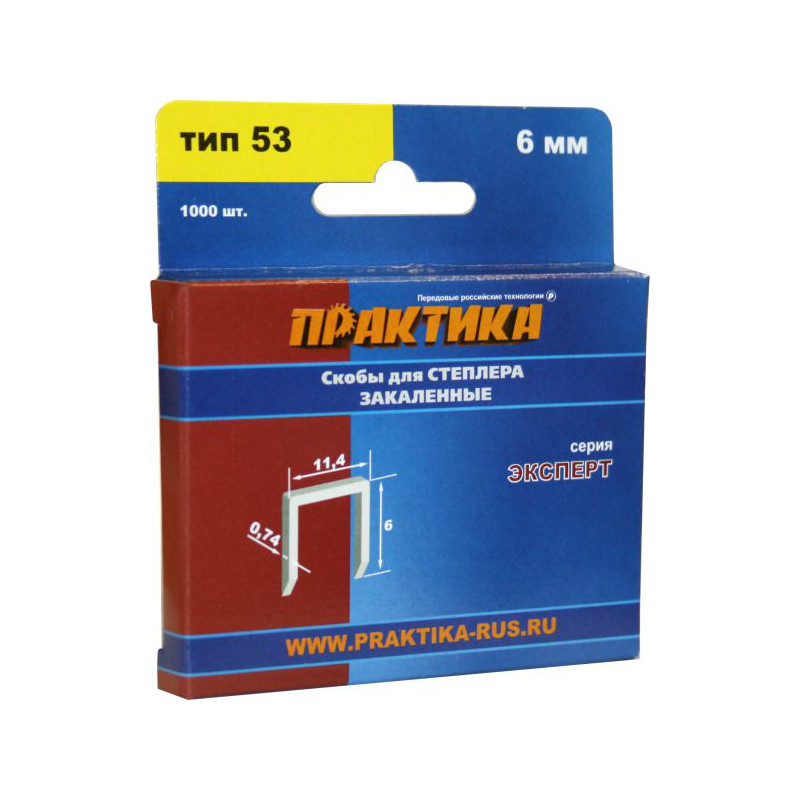 Скобы ПРАКТИКА для степлера, серия Эксперт, 6 мм, Тип 53, толщина 0,74 мм, ширина 11,4 мм, (1000 шт) коробка