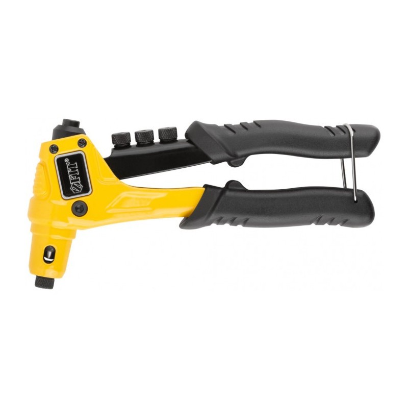 Заклепочник предназначен для крепления вытяжных заклепок из алюминия, стали и нержавеющей стали. Усиленная конструкция обеспечивает эффективную работу. Инструмент имеет литой корпус из алюминия, трехкулачковый механизм захвата заклепок из хромомолибденовой стали. Подвижная рукоятка с ПВХ накладками удобна в работе.