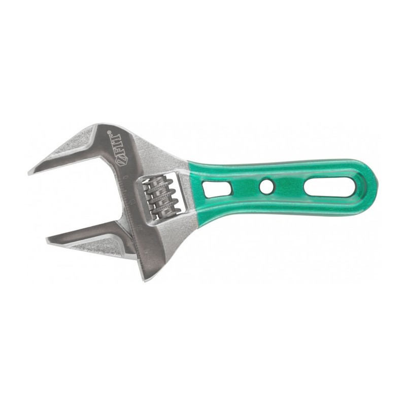 Укороченный. Экстраувеличенный рабочий диапазон губок. Уменьшенная толщина губок и сниженный вес для работы в труднодоступных местах. Размерная шкала. Материал: штампованная термообработанная хром-ванадиевая сталь с хромированным покрытием, ПВХ-накладка на рукоятку. Тип упаковки: картонный подвес.