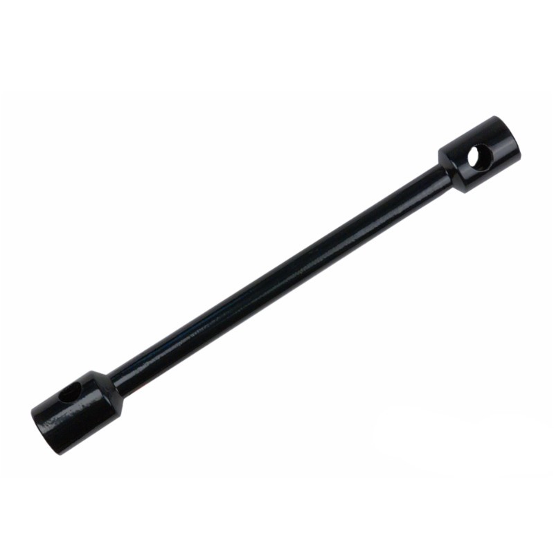 Баллонный ключ выполнен из качественной углеродистой стали, твердостью не менее 40 HRC. Нанесено специальное покрытие, которое предотвращает распространение коррозии. Ключ длиной 465 мм, обеспечивает достаточный рычаг для легкого и надежной фиксации болта на колесе. Баллоник имеет отверстие под монтажку (диаметр 22 мм), что позволяет увеличить скорость и силу закручивания. Вес ключа – 1700 гр.