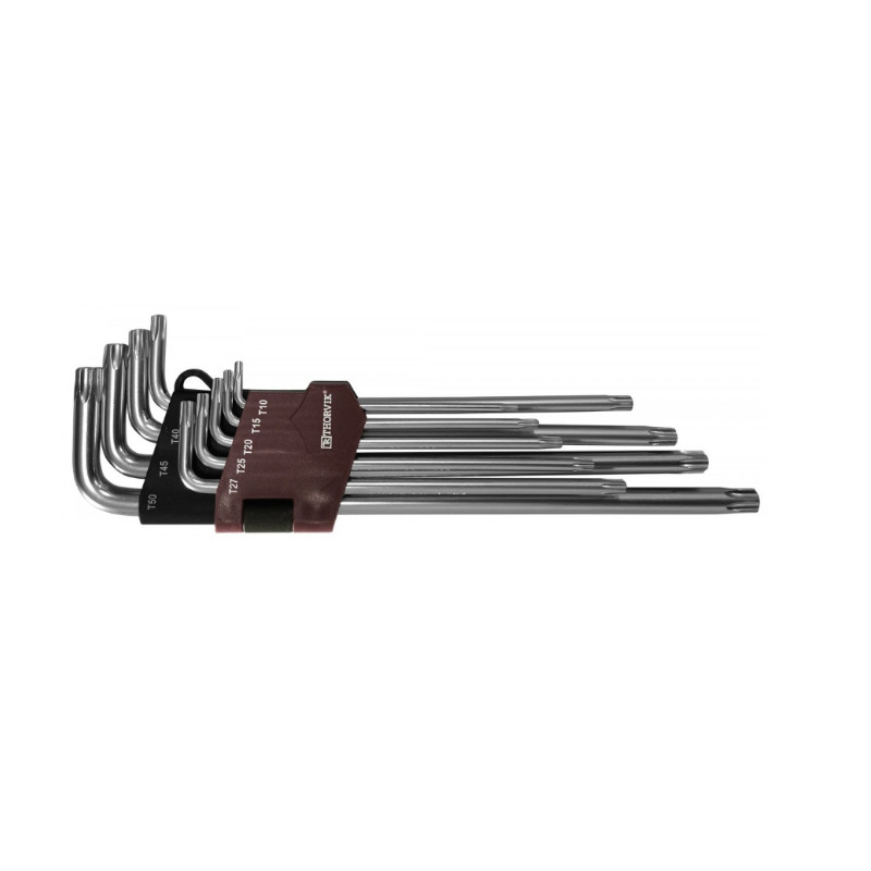 Набор торцевых ключей T-TORX удлиненных с центрированным штифтом Thorvik TTKL9S Т10H-T50H, 9 пр. 53160 выполнен из высокопрочной стали, которая выдерживает усиленное вращение инструмента.