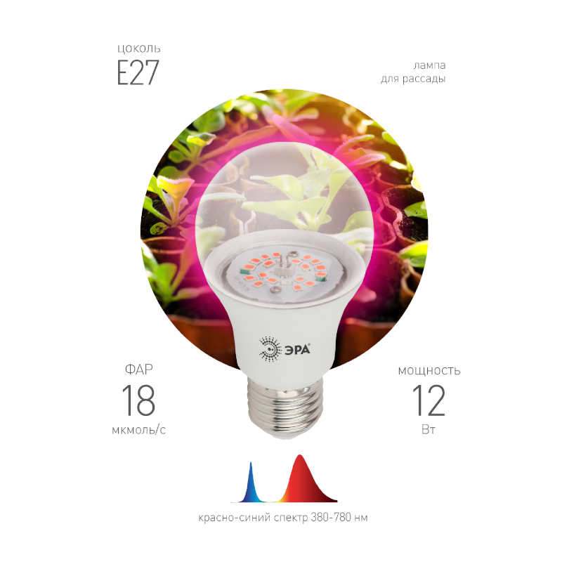 Красно-синий спектр способствует активному фотосинтезу и укреплению корневой системы. Диоды с длинной волны 730 нм предотвращают вытягивание растений, обеспечивают правильное соотношение длинны и площади листьев растений, делают растение приземистым и прочным. Так же красно-синий спектр обеспечивает питание и образование сахаров в растениях, ускоряет рост и набор био массы. Лампу можно использовать как для освещения взрослых растений, так и для рассады. При добавлении к лампе стандатного источника света 4000 К лампу можно использовать в закрытых от солнечного света помещениях.