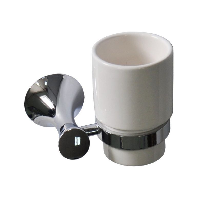 Стакан керамический с креплением к стене, правильной формы на основании, хромированный. Изделие выполнено из белой керамики и металла с хромированным покрытием.