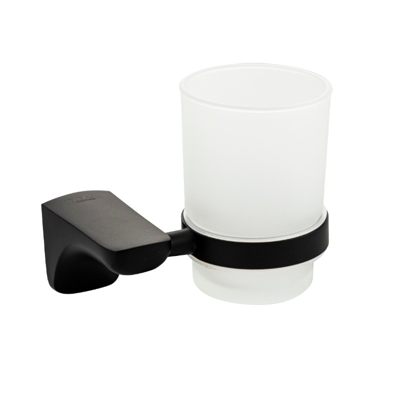 Стакан стеклянный с креплением к стене, правильной формы на основании, чёрного цвета.