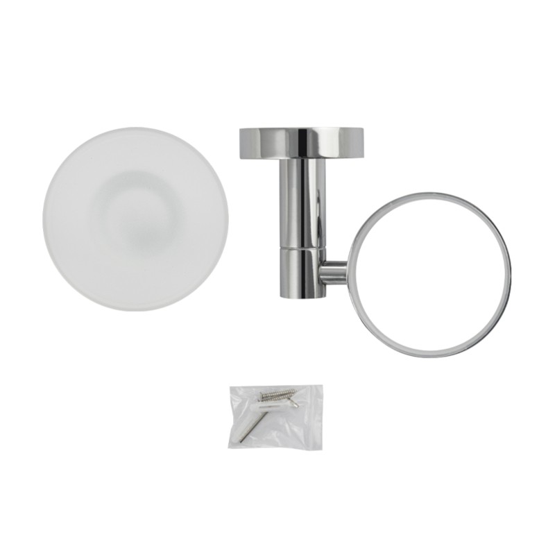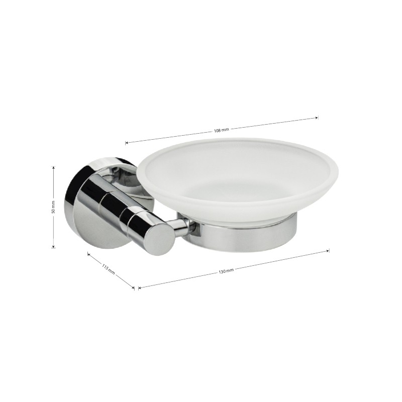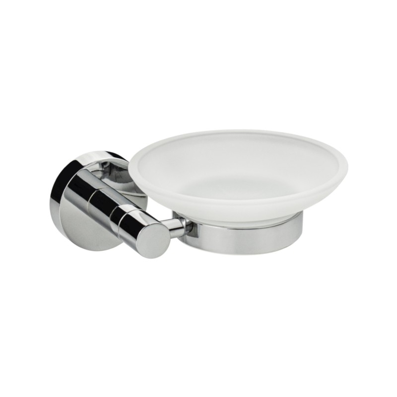 Мыльница подвесная, стеклянная с креплением к стене, круглой формы на основании, хромированная.