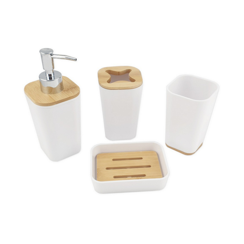 Набор аксессуаров для ванной комнаты настольный, пластик АБС белый с вставками из бамбука, состоит из 4 предметов: дозатора для жидкого мыла, стакана (подставки) для зубных щёток, мыльницы и стакана для принадлежностей.