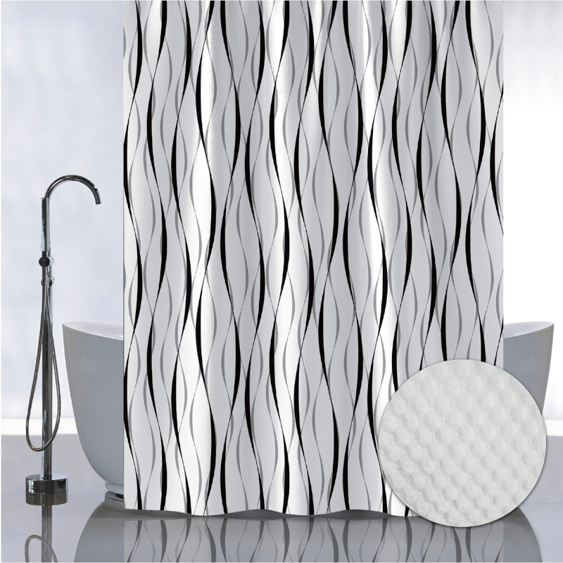 Штора для ванной комнаты с теснением рельефная, защищает пол и оборудование ванной комнаты от брызг воды, изготовлена из полиэстера и микрофибры с гигроскопической пропиткой обладает выраженными водоотталкивающими свойствами. Штора имеет в верхней части 12 отверстий обработанных на оверлоке. Декоративный рисунок нанесен на поверхность ткани при помощи фотопечати.