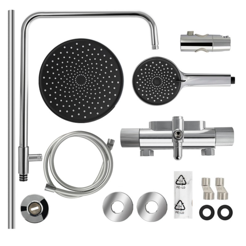 Аксессуар оснащен термостатическим картриджем с шумоподавлением и керамической кран-буксой, стойка с двумя хромированными лейками и шлангом.