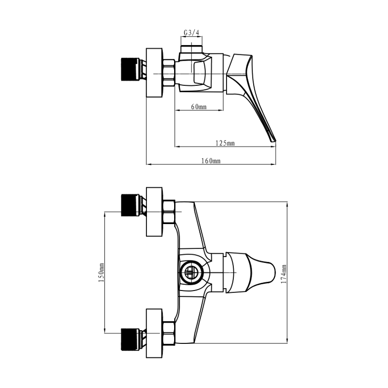 Корпус из латуни, хромированнное покрытие, 40 мм керамический картридж, нормальный тип распыления, угловой штуцер из нержавеющей стали, накладки крепления к стене из нержавеющей стали.