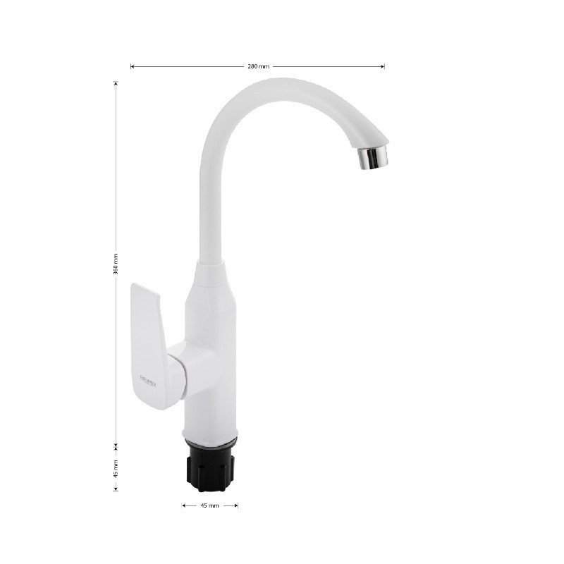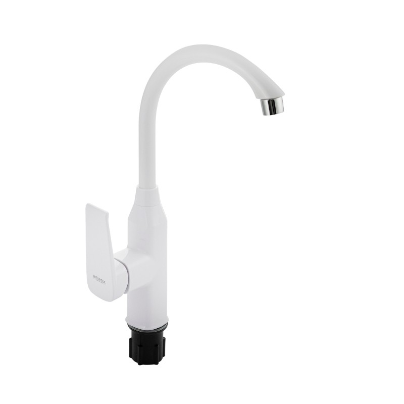 Смеситель для кухонной мойки и раковин, из высокопрочного пластика АБС, БЕЛЫЙ, боковой, с высоким С-образным изливом, шаровый, квадратный корпус.