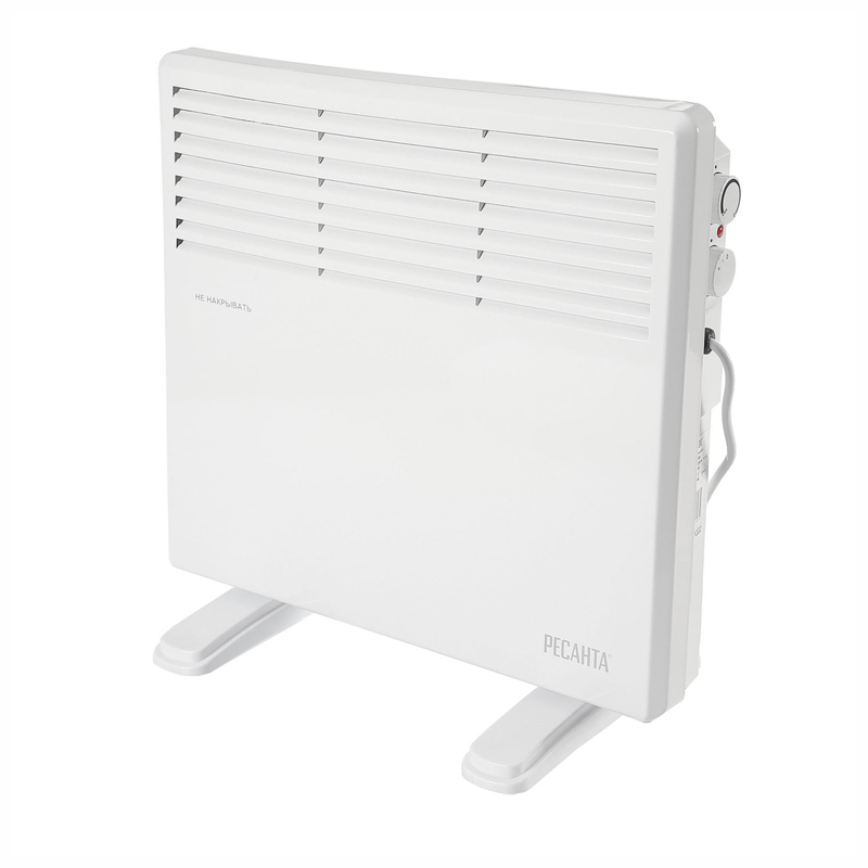 Электрический конвектор РЕСАНТА ОК-1000 для обогрева помещений. Состоит из нагревательной части (ТЭН), заключенной в нижней части корпуса со щелеобразными отверстиями снизу и жалюзи в верхней части. Данная конструкция даёт возможность воздуху беспрепятственно проходить внутри конвектора,