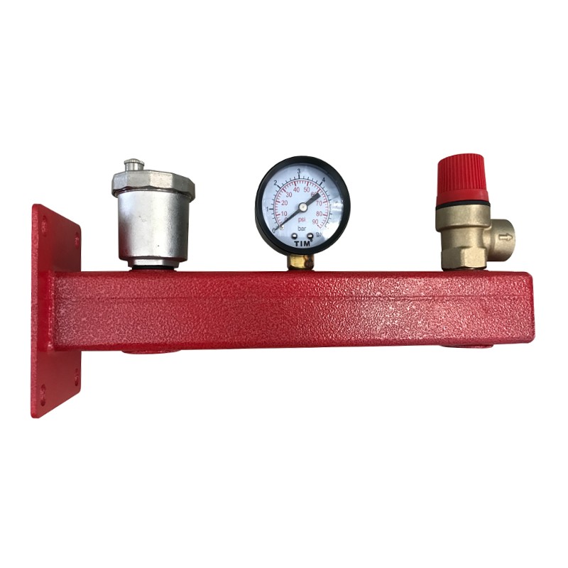 Комплектная группа безопасности для оснащения котлов , ГВС. Рабочая температура не более 110 °С. Допустимая рабочая среда – пар, вода, незамерзающий теплоноситель (максимальное содержание гликолей – 50 %). Состав изделия: предохранительный клапан (настройка – фиксированная, 3 бара), автоматический воздухоотводчик, манометр, стальной корпус. Группа безопасности котла монтируется на выходе теплогенератора. Резьба присоединения – внутренняя, 3/4”.