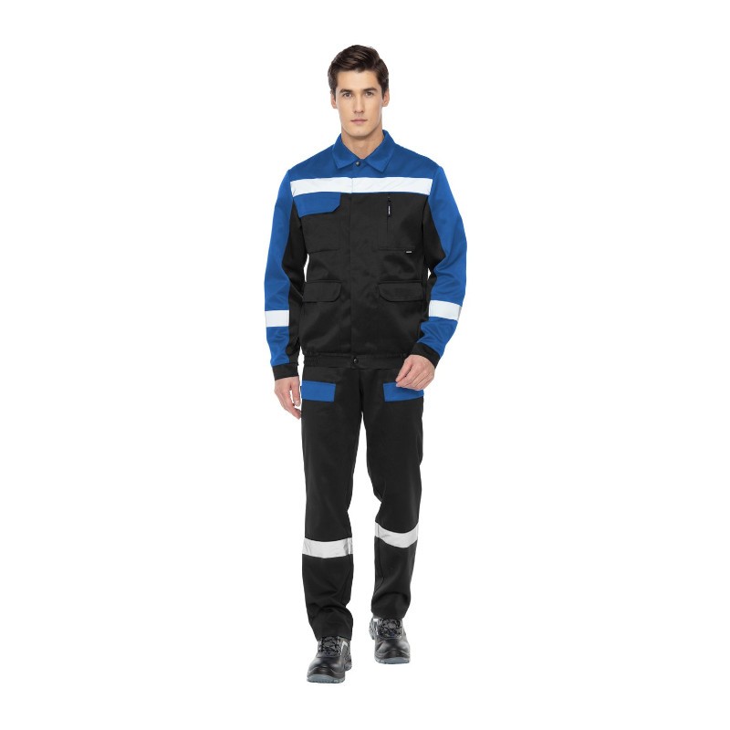 Полукомбинезон с застежкой на пуговицы в правом боковом шве и с гульфиком на молнии. Бретели с регулировкой длины и с застежкой на фастексы. На грудке вместительный карман на молнии. На передних половинках накладные карманы с усилением и скрытым объемом по низу. На спинке кулиса с резинкой для регулировки объема по талии. На задней правой половинке накладной карман со скрытым объемом по низу, карманы для различных мелких инструментов, а также петля из стропы для фиксации крупных инструментов. По низу кокеток, на рукавах куртки и по низу полукомбинезона широкие световозвращающие полосы для безопасности при работе в условиях плохой видимости.