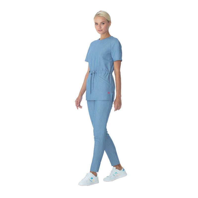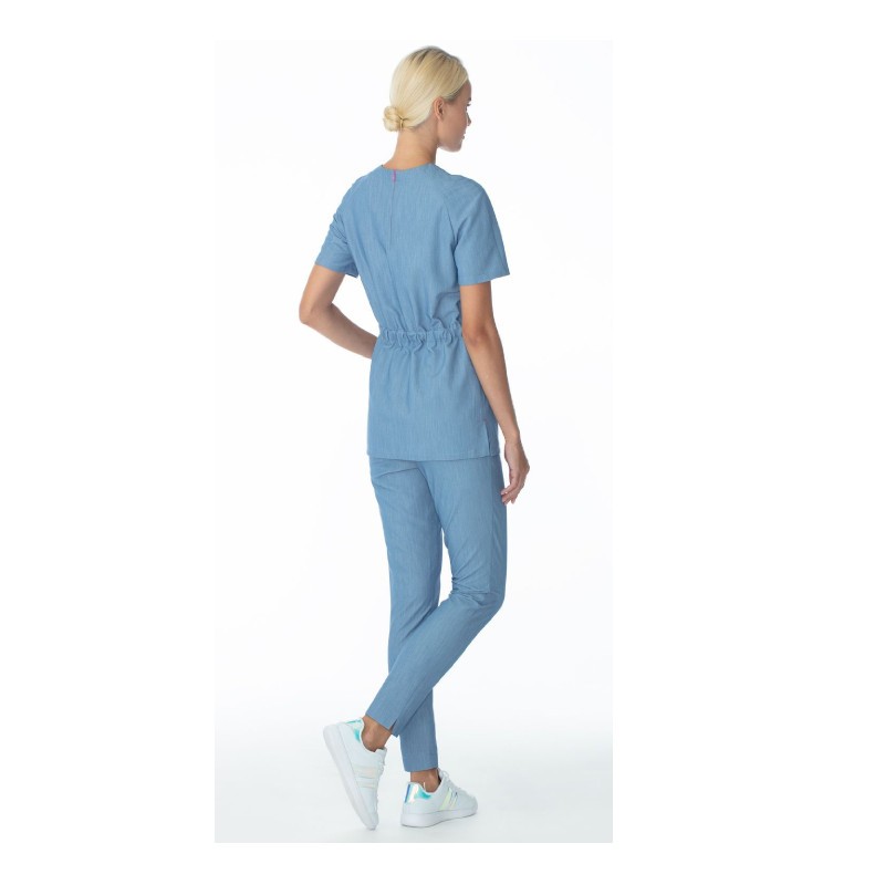 Рукава короткие, покроя реглан. По низу боковых швов блузы предусмотрены небольшие разрезы для удобства при эксплутации.