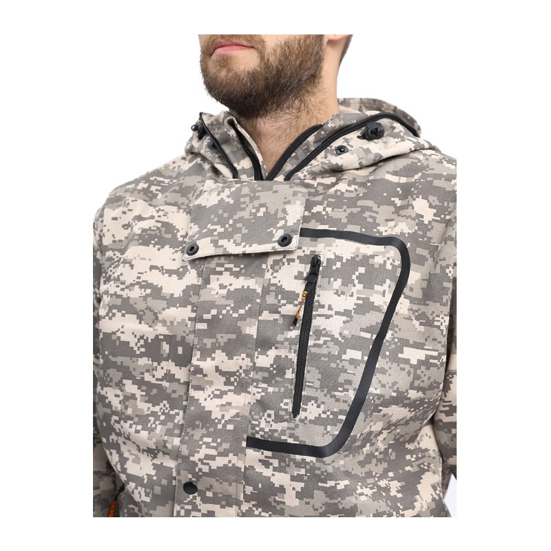 Куртка укороченная на поясе с резинкой - центральная застёжка молния и ветрозащитный клапан на кнопках - капюшон с козырьком и противомоскитной сеткой на молнии, исключающей проникновение насекомых под одежду - противомоскитная сетка убирается в карман и фиксируется клапаном на кнопке, расположенный на капюшоне - капюшон с кулиской по лицевой части, резинка шнур регулируется с помощью фиксаторов - на затылочной части капюшона хлястик на липучке - карманы на молнии, нагрудный карман выделен термонаклейкой - низ куртки и манжеты рукавов на резинке.