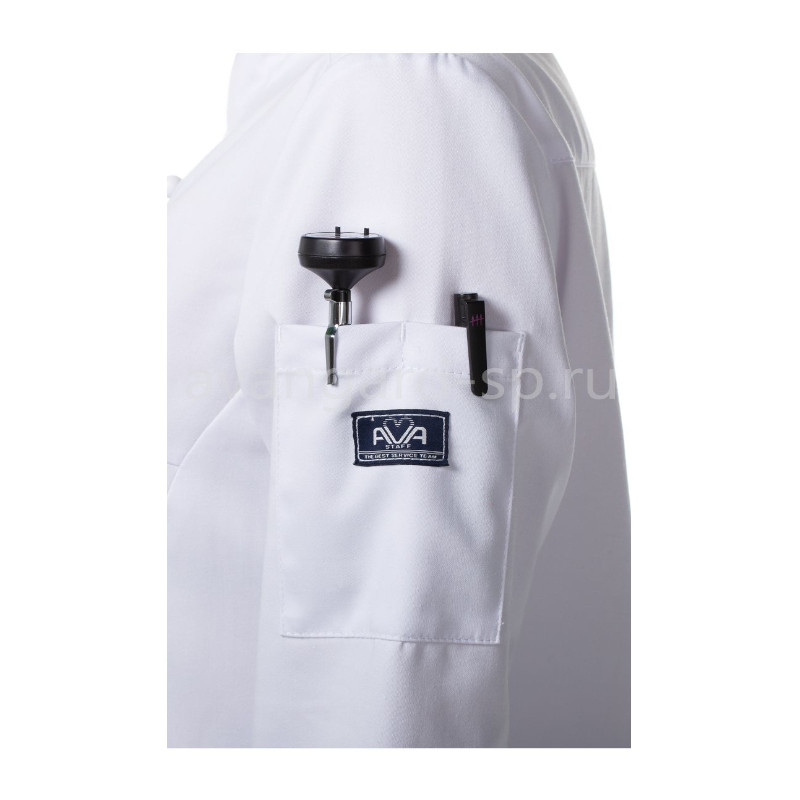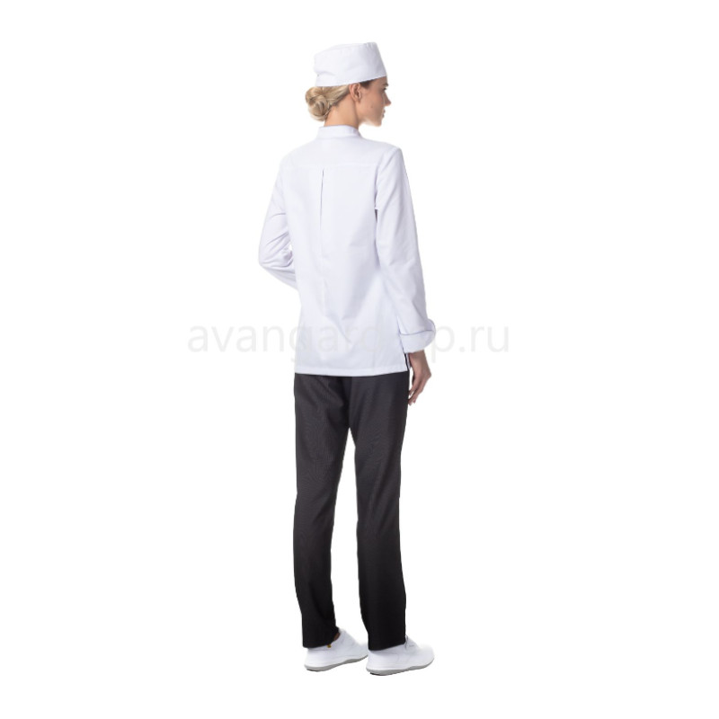Классическая поварская куртка прямого силуэта с двубортной застёжкой на пуговицы-пукли.