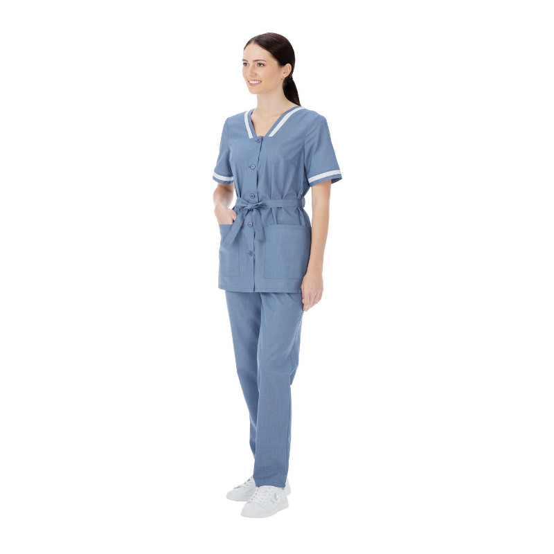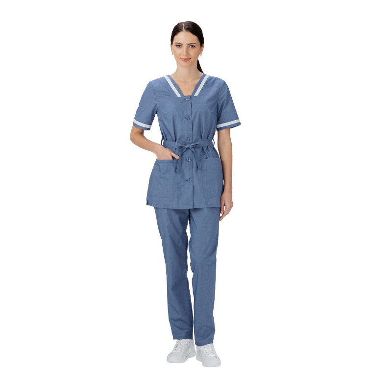 Блуза удлиненная прямого силуэта, с центральной застежкой на пуговицы. V-образный вырез горловины с планками из отделочной ткани. Вместительные накладные карманы по низу. Рукава длиной выше локтя с отделкой по низу. По талии - пояс со шлевками для регулировки объема. Брюки умеренного объема на резинке по поясу. На передних половинках верхние боковые карманы.