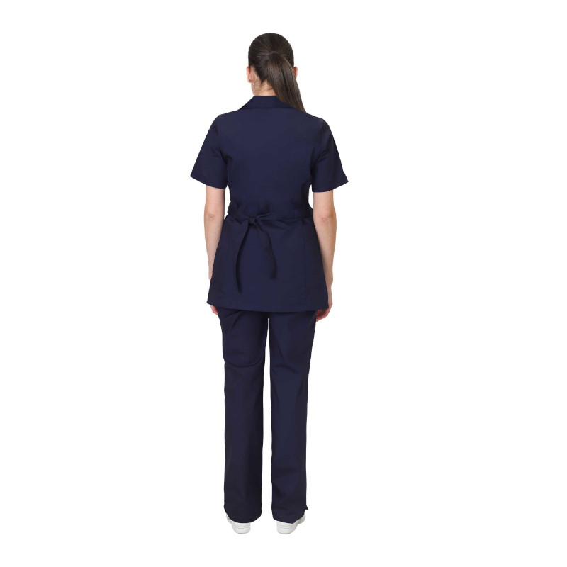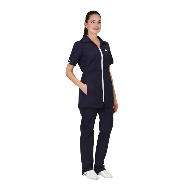 Блуза полуприлегающего силуэта с центральной застёжкой на молнию, с завязывающимся сзади поясом. Воротник отложной. Два боковых кармана в рельефных швах. Один нагрудный накладной фигурный карман. Рукава втачные короткие. На нагрудном кармане и рукавах паты из ткани белого цвета. Брюки прямые на притачном поясе, частично стянутом на эластичную тесьму, спереди на поясе вставка.