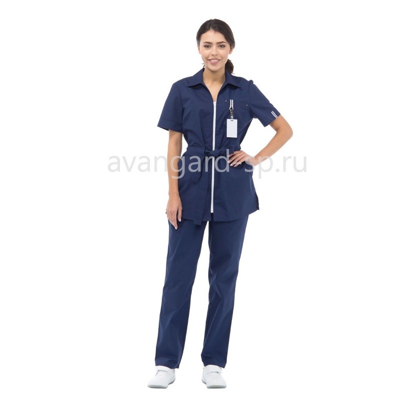 Блуза удлиненная прямого силуэта, с застежкой на молнию и поясом по талии. Воротник отложной. Нагрудный карман с тесьмой и кольцом для крепления бейджа. Нижние накладные карманы со шлевками для пояса. На спинке длинная шлевка для крепления пояса. Втачные короткие рукава с декоративным отворотом по низу. По низу блузы, по боковым швам, небольшие разрезы. Брюки прямого силуэта с эластичным поясом по талии.