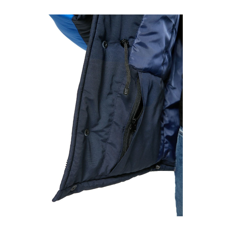 Со стороны подкладки утепленной мужской куртки расположены 2 больших кармана: один с эластичным верхом для шапки, перчаток, папки А4; второй - на молнии с внутренним карабином для ключей на тесьме.