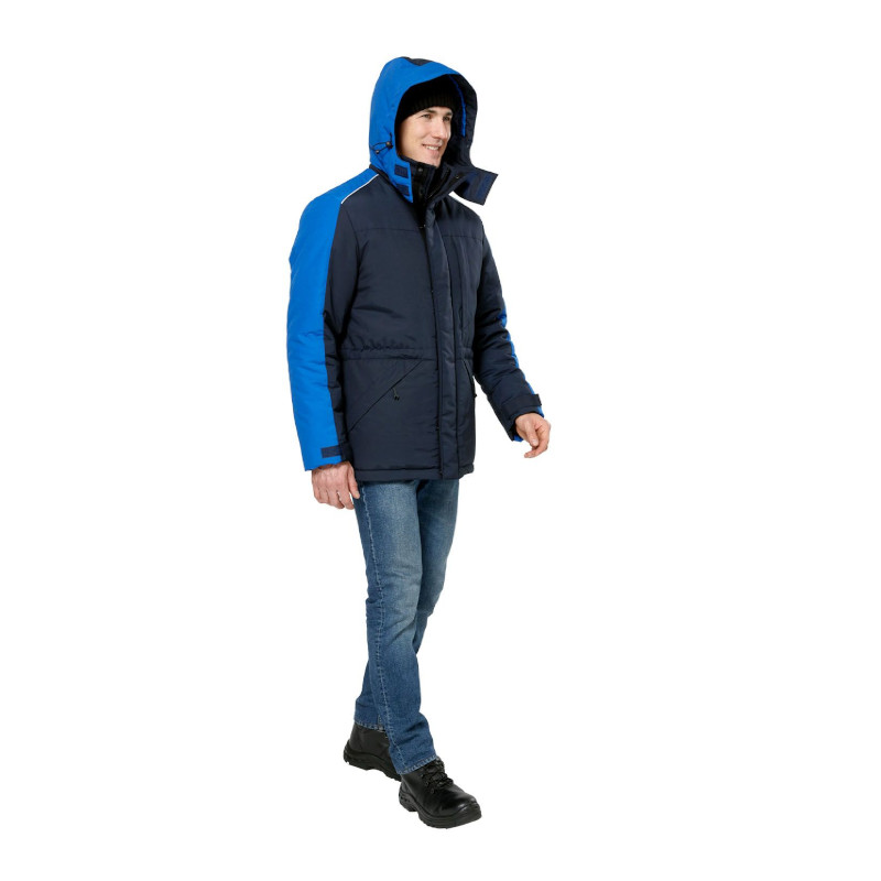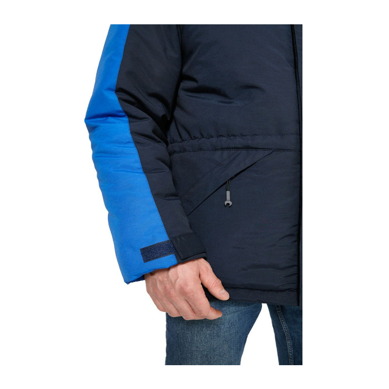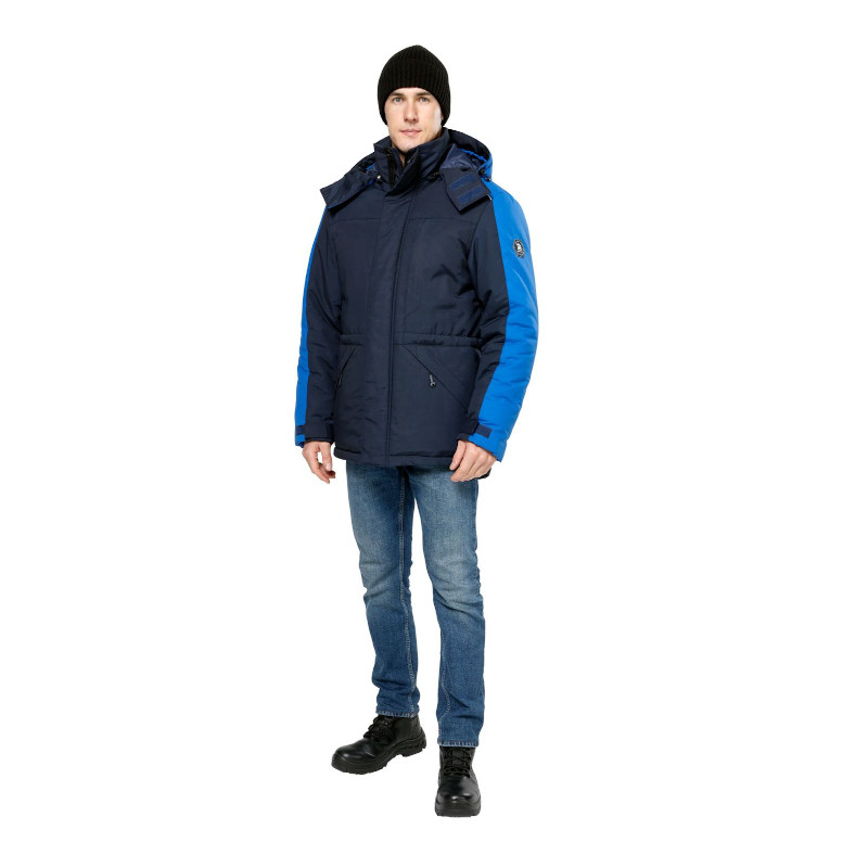 Куртка мужская утепленная прямого силуэта, с центральной застежкой на молнию под ветрозащитной планкой на кнопках, усиленных дополнительно тесьмой.