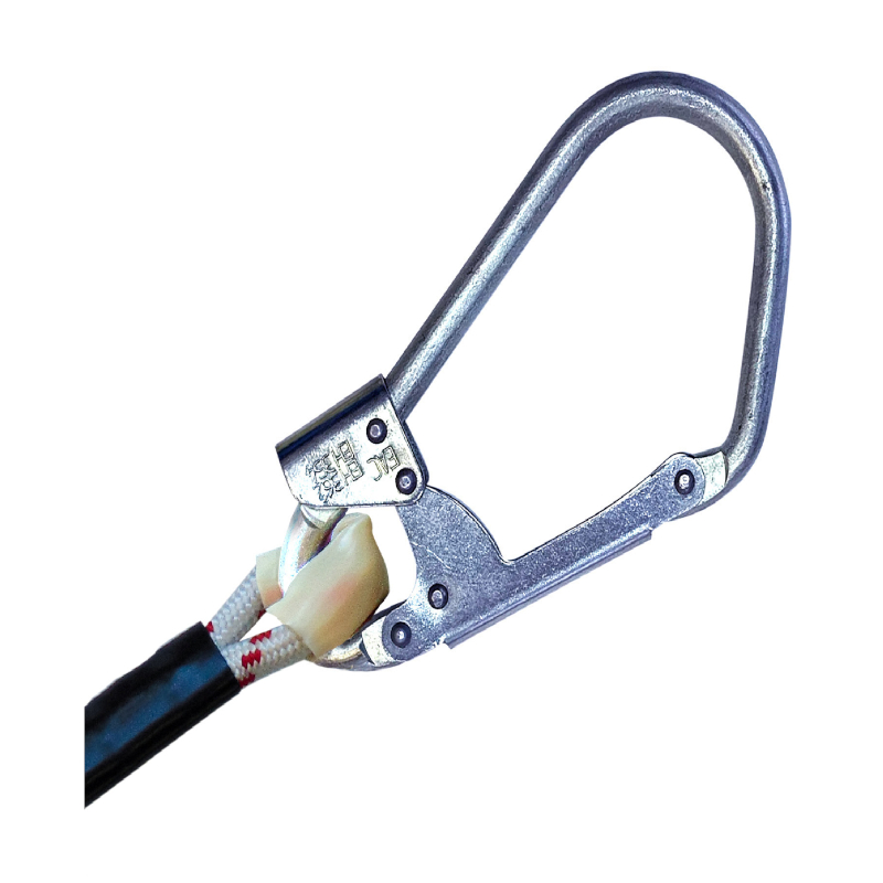 Двуплечий страховочный строп из 24-х прядной полиамидной верёвки с двумя большими монтажными карабинами, винтовым соединительный карабином и амортизатором рывка.