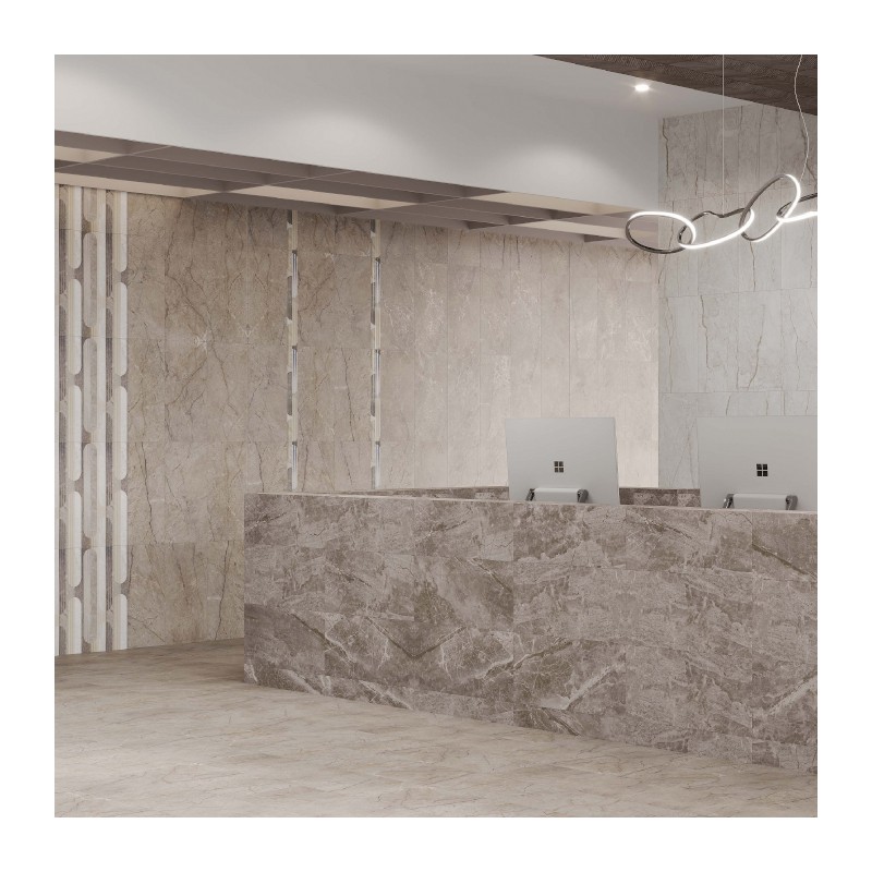 Коллекцию непременно оценят любители естественных, природных тонов и интерьере. Её основой являются образцы с тремя фактурами натурального камня, исполненными в трёх цветовых вариациях: молочном, светло-сером и графитовом. Выразительный рисунок с тонкими, но активными прожилками придает пространству динамики , а благородный матовый блеск его поверхности создаёт ощущение подлинного природного мрамора. Декоративные элементы - трендовый дизайн в эстетике 60-х годов с круглыми и овальными мотивами, а также рельеф "под ёлочку" - предлагают интересную игру акцентов. Коллекция универсальна и может быть использована в различных стилях интерьера, как классических, так и ультрасовременных.