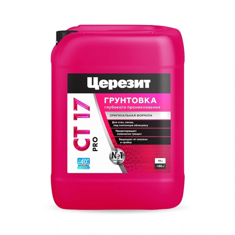 ОБЛАСТЬ ПРИМЕНЕНИЯ: Грунтовка CT 17 PRO предназначена для наружных и внутренних работ для обработки поверхностей перед нанесением штукатурных и напольных смесей, плиточных клеев и других поверхностей.