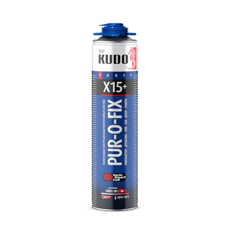 Экономия и эффективность: 1 баллон заменяет 15 картриджей (310 мл) строительного клея «жидкие гвозди», при этом KUDO® PUR‑O‑FIX в несколько раз дешевле. Выход из 1 баллона — около 300 метров клея-пены при диаметре жгута 10 мм*.