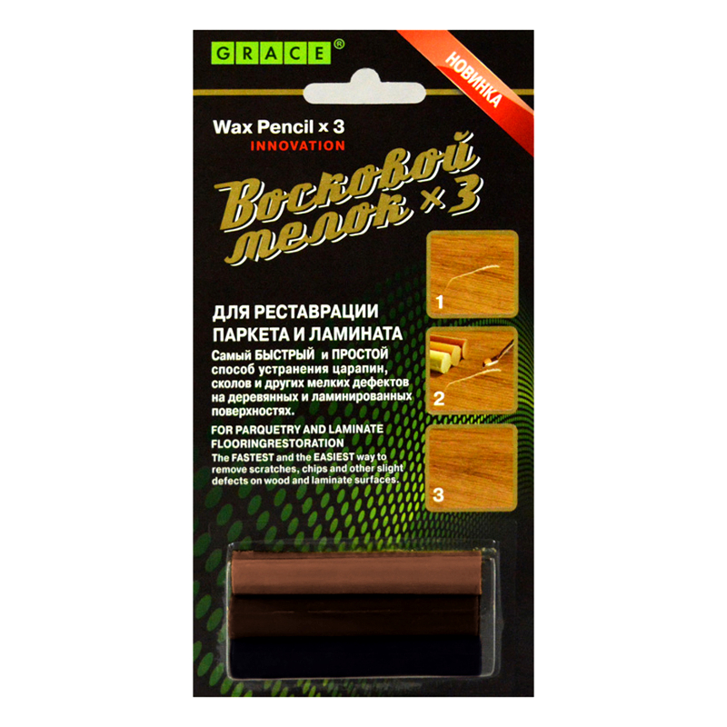 Воск для дерева применяется для устранения мелких повреждений древесины и ламината (трещины, сколы, царапины), а так же для обеспечения влагостойкости поврежденного участка. В комплект входит три оттенка мелков.