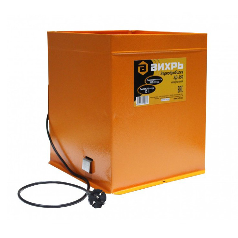 Зернодробилка ВИХРЬ ЗД-350 с однофазным коллекторным электродвигателем состоит из трёх элементов: загрузочной камеры, камеры измельчителя и моторного отсека. Тип бункера квадратный, его ёмкость составляет 10 л. Измельчитель зерна дробит сырьё на мелкие фрагменты при помощи лезвий, а затем пробивает его через сито. Частота вращения ножа: 12000 об/мин.