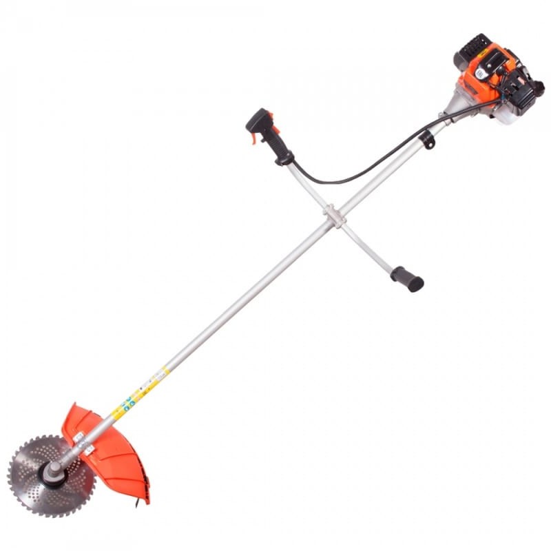 бензотриммер, шпуля полуавтоматическая, сменный нож 40-зубный с твердосплавными напайками, защитный кожух, ремень ранцевый, винт фиксации рукоятки (4шт), рукоятка, комплект инструментов, руководство по эксплуатации, коробка