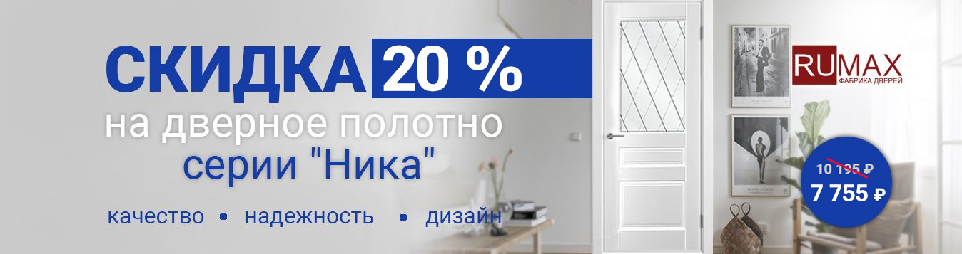 - При покупке дверного полотна серии «Ника» торговой марки RUMAX предоставляется скидка до 20%;
